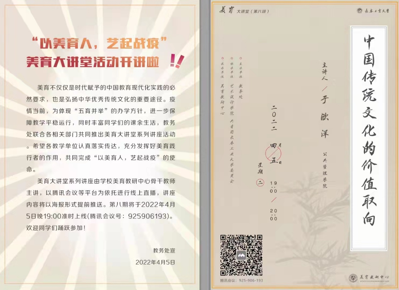 “以美育人,艺起战役”美育大讲堂是在当下抗疫背景下开展的系列讲座活动,是弘扬中华优秀传统文化的重要途径。