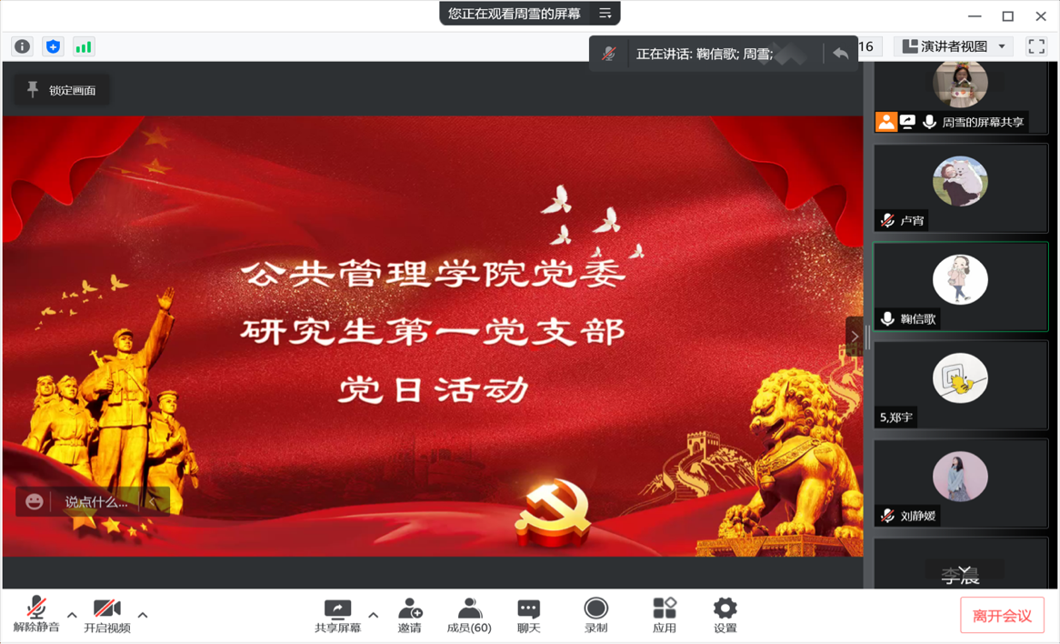 研究生第一党支部书记鞠信歌老师询问了支部党员们身处不同地区的防疫现状,党员们踊跃发言:聂辛哲同学分享了自己在抗疫重地吉林市九台区积极配合政府工作采用网格方式配送物资的防疫事迹;周雪同学代表在校同学们阐述了封校后在党中央的正确领导以及吉林省委的正确部署下,校领导、老师以及志愿者们的辛苦付出,学校防
