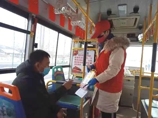 作为3路公交车上的志愿者小张主要负责给车上乘客测量体温、登记信息,并且维护秩序。