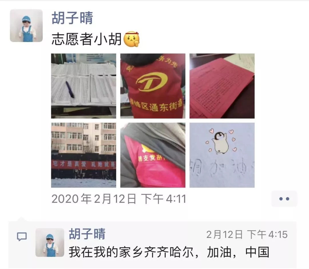 在祖国的边陲黑龙江省齐齐哈尔市,有最美逆行者,他们已经开始第四次援鄂行动,也有一直工作在医疗一线的医务工作者,还有在寒风里恶劣的天气中坚守岗位的警察同志,更有社区工作人员坚守在基层一线,守卫社区居民健康安全。而她也在里面尽自己微弱的一份力量,她叫胡子晴,是52av