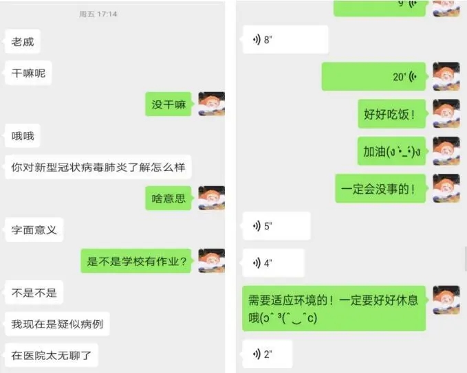 2020年2月13日,刚刚执勤回家的戚瀚文接到一名初中同学的微信消息,得知这名同学因是新冠肺炎疑似病例被隔离治疗。收到消息后他不仅没有因为同学是疑似病例而歧视,反而是耐心做同学的心理疏导工作,关心衣食起居,病情检查情况,每天的早晚安已经成了戚瀚文生活必不可少的部分,虽然不能去探望,但作为朋友,作为疫情防控志愿者,他用他力所能及的方式尽一份心。