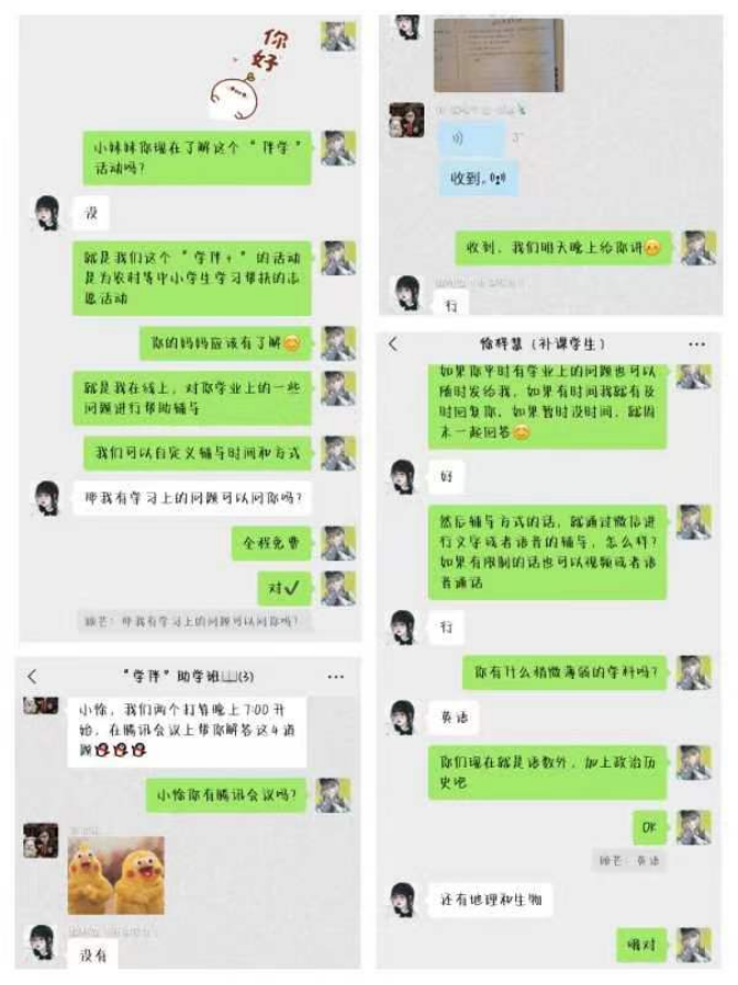 一批政治觉悟高、业务素质好的优秀青年积极主动报名参加,并在第一时间完成结对子。“学伴+”志愿者们根据服务对象年级、学科、主要学业帮助诉求等,组建“一对一”、“多对一”的学业帮帮团,通过微信、QQ等即时通讯软件,及时解答服务对象学业问题,用热情与真诚践行志愿精神,得到了学生家长和学生们的一致认可和好评。接下来让我们一起看看52av