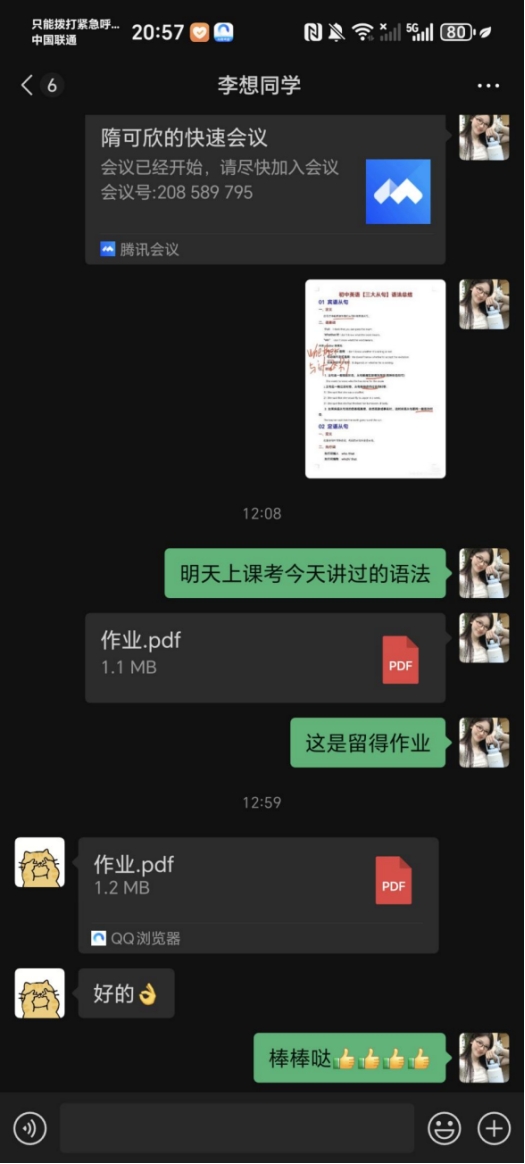 初次交流时,我全面了解他的英语学习情况,明晰优势与薄弱环节后,精心规划教学内容,力求每节课都精准高效。课后布置少量练习题,助力他巩固知识,熟练运用英语语法解题。