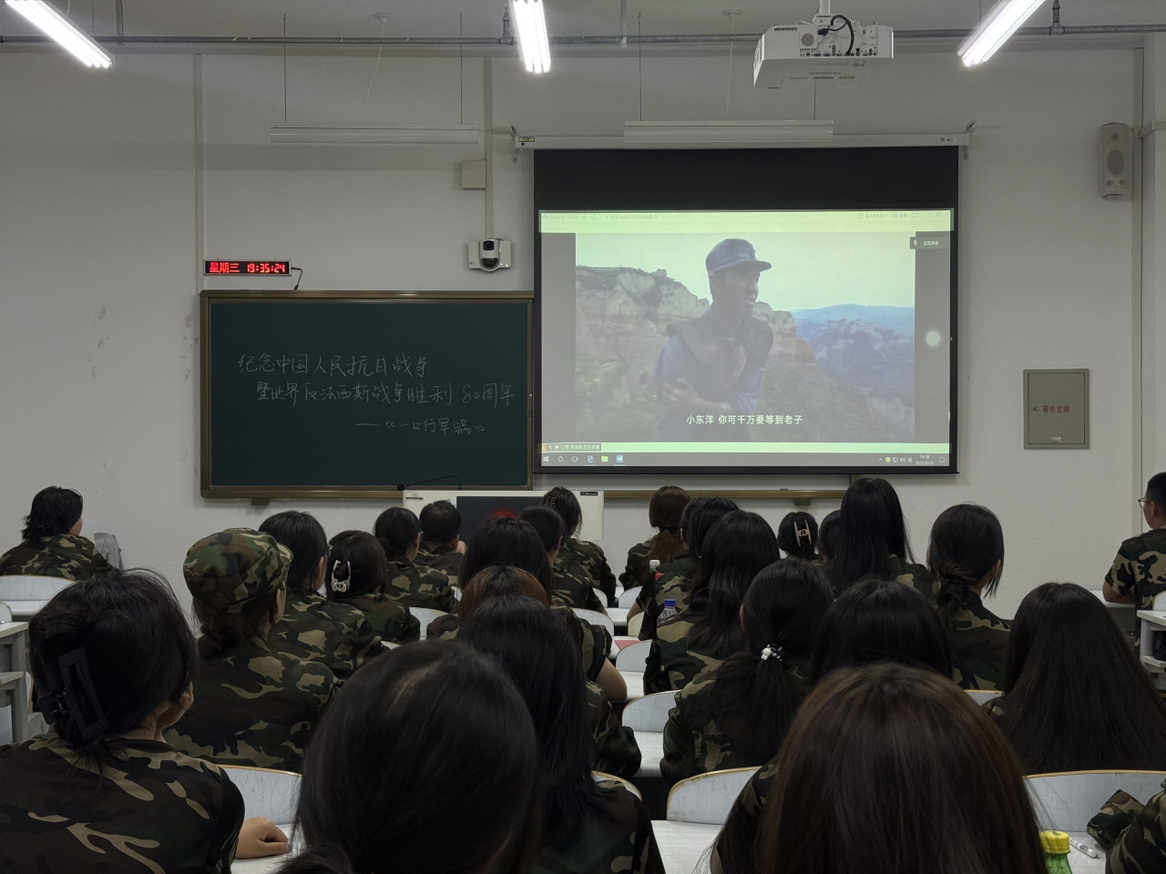 于北湖东校区主楼205教室组织25级全体新生共同观看红色影片《一口行军锅》。以光影为媒介,带领同学们穿越时空,重温革命先辈的峥嵘岁月,在沉浸式观影中厚植家国情怀,凝聚军训奋进力量。