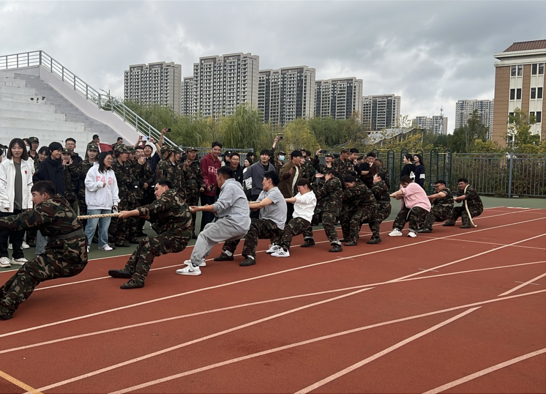 观众方阵气势磅礴,助威声此起彼伏、响彻全场。参赛队员们精神抖擞、斗志昂扬,他们紧握麻绳、齐心协力,每一次发力都彰显着团队协作的默契与全力以赴的决心。比赛全程氛围热烈,欢呼声、呐喊声交织,新生们在比拼中展现出的凝聚力与拼搏精神格外夺目,每一个咬牙坚持的瞬间,都诠释着青春的坚韧与倔强。