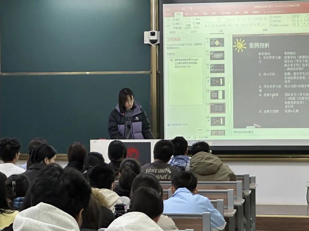 宣讲过程中,现场氛围热烈,新生们专注聆听、积极提问,学姐们逐一耐心解答,用真实经验化解新生顾虑,为大家理清了参加创新类大赛的思路与方向。同学们纷纷表示,学姐们的分享不仅让自己对创新类大赛有了更清晰的认知,更激发了主动探索、勇于尝试的热情。