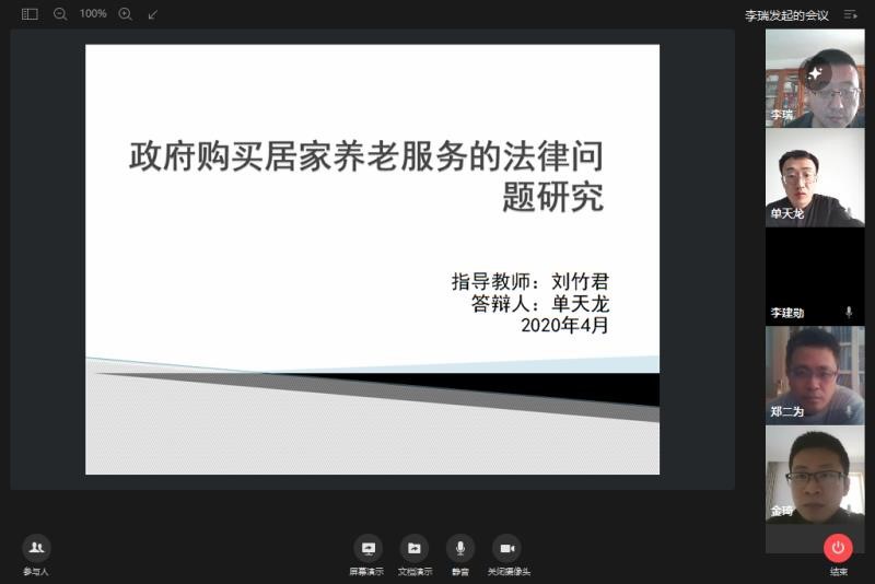 此次预答辩涉及全院8个专业、45位评委老师及171名毕业生,通过企业微信、腾讯会议平台分学科分批次进行。由于是学院第一次利用线上形式组织预答辩,为确保本次预答辩顺利完成,主管研究生工作的吕红副院长和各学科负责人成立了预答辩小组,精心谋划、周密部署,多次组织召开线上研讨会、明确分工、细分流程,制定紧急预案。本次预答辩共划分15个答辩小组,每个答辩组由3位评委老师组成,其中1位老师为评委兼职秘书,主要负责确定答辩时间、邀请其他两位评委老师及本组学生进入线上答辩会场、提前进行设备的调试与模拟演练以及收齐学生的学位论文发送给评委老师审阅。为保证远程视频答辩的严肃性及规范性,答辩秘书老师还进行了拍照录音,整个过程中网络通话基本无卡顿、声音清晰。