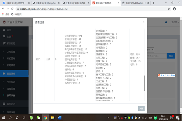 全体师生积极参与此次网络招聘会,截止4月29日17:00,共有1113名师生参与到此次招聘会中。投递简历316份,初步达成就业意向7人。
