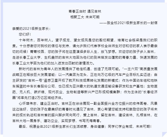 第一时间转载并发布了校《青春正当时 遇见吉林 未来可期——致全省高校入学新生的一封信》,将此信传达到全体入学新生,做到全覆盖。与家长进行积极的互动,让家长更清楚的认识、了解和深入吉林,支持和鼓励自己的孩子可以在毕业后投身于吉林的发展。