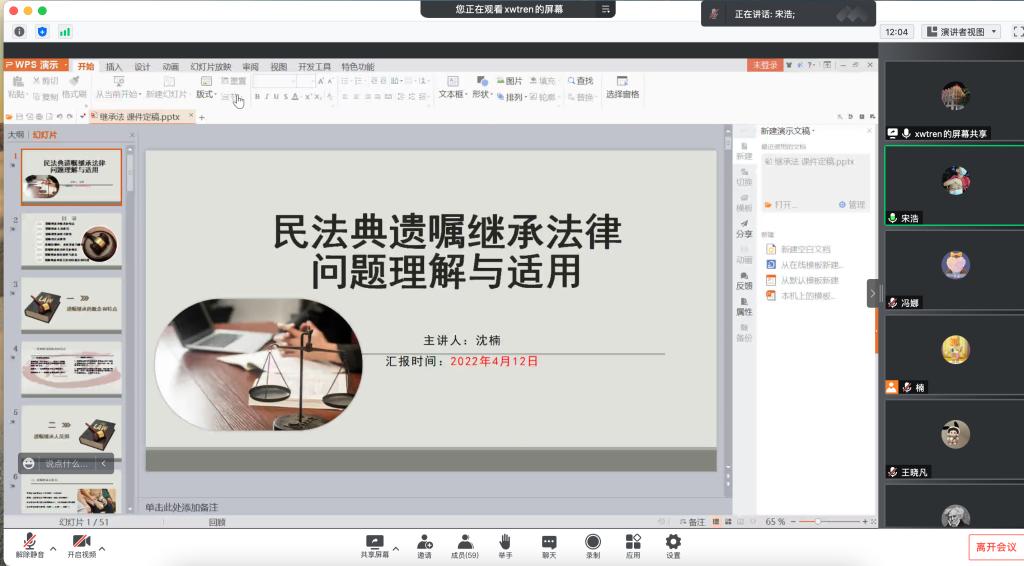 “法律大讲堂”第三季“民法典与美好生活同行”第二讲《<民法典>遗嘱继承法律问题的理解与适用》于2022年4月19日17:30在腾讯会议线上开讲。本期主讲嘉宾是长春市汽车经济技术开发区人民法院审判委员会委员、立案庭庭长沈楠法官。讲座由法学系主任宋浩老师主持,法学系百余名师生旁听讲座。