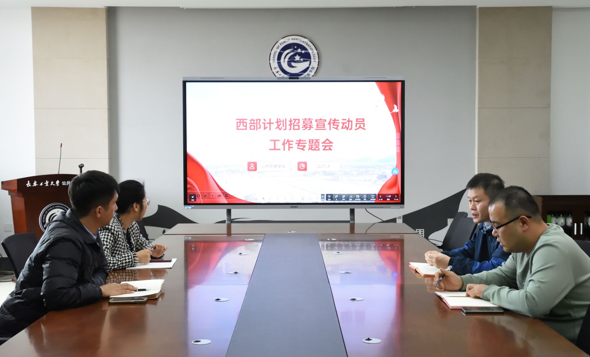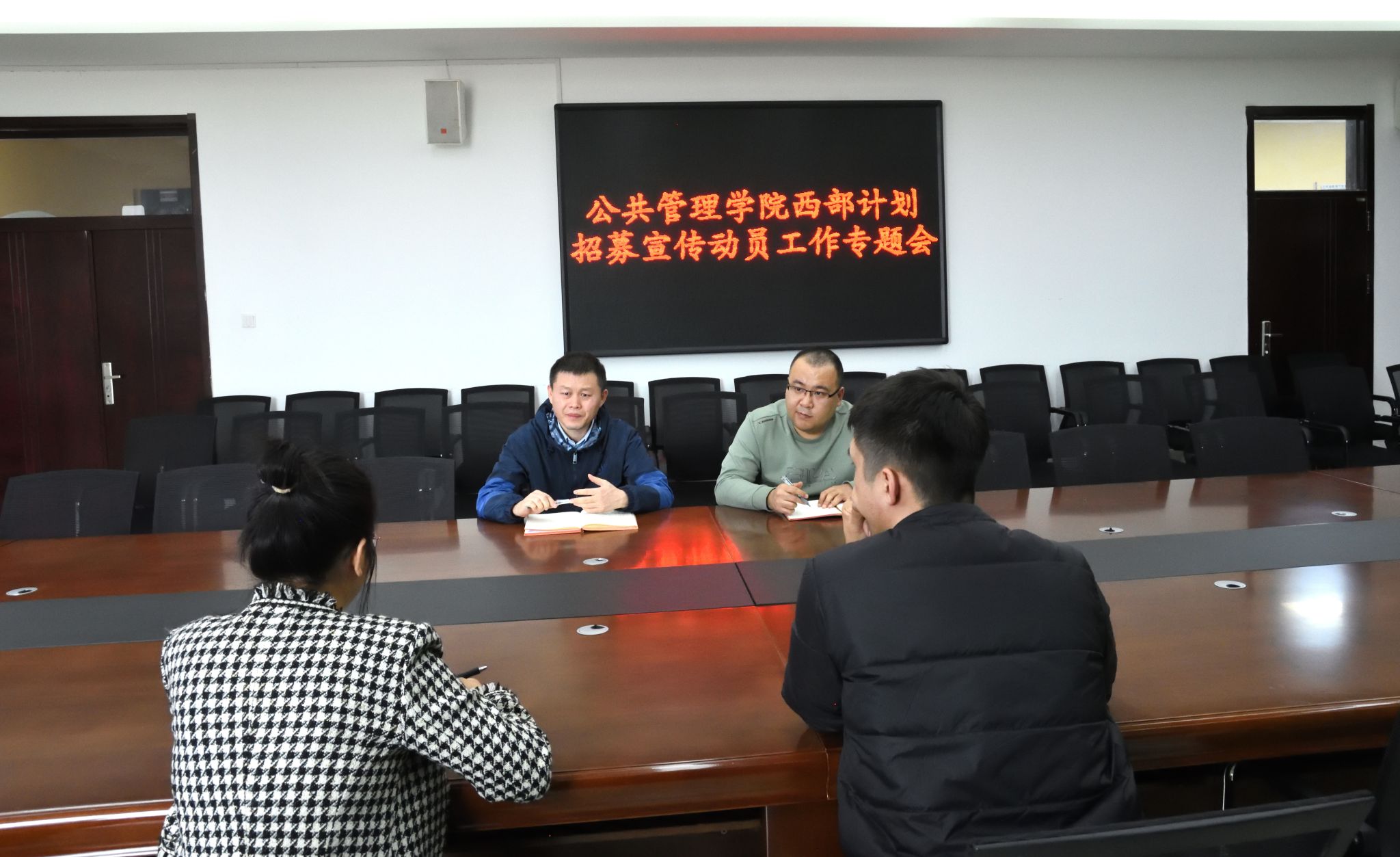 在北湖校区东区401教室召开西部计划招募宣传动员工作专题会。学院党委副书记陈磊,组织员24级辅导员老师崔元慧,22级辅导员老师哈那提别克·米乃,23级辅导员老师初靖皓共同参会,就西部计划招募宣传工作进行深入研讨与部署。