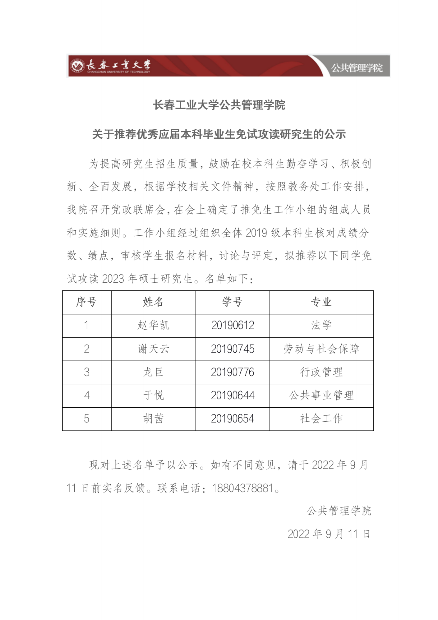 关于推荐优秀应届本科毕业生免试攻读研究生的公示